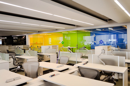 此案例裝修的色調很中性化,創造一個舒適的、現代的、環保的辦公環境。這樣才更契合它們的企業文化和品牌形象,體現企業的民主。它的主要特征幾乎全都在主辦公區得以體現。