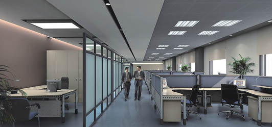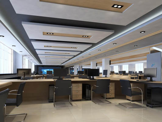 這一類型的空間裝修設計的主要特點就是相互之間沒有采用高隔斷墻體來分離空間,它的大辦公區的設計是很有條理性的,開敞式格局的寫字樓辦公區裝修設計,俗稱開放式寫字樓辦公裝修設計。