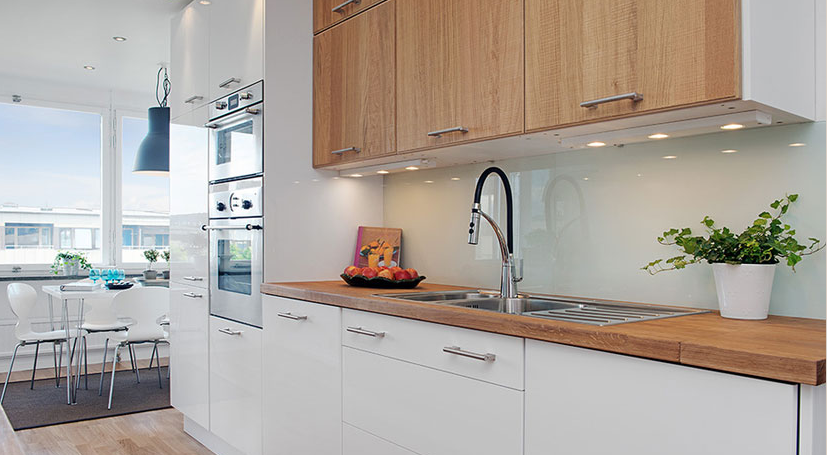 (1)一字型:把所有的工作區都安排在一面墻上,通常在空間不大、走廊狹窄情況下采用。所有工作都在一條直線上完成,節省空間。但工作臺不宜太長,否則易降低效率。在不妨礙通道的情況下,可安排一塊能伸縮調整或可折疊的面板,以備不時之需。